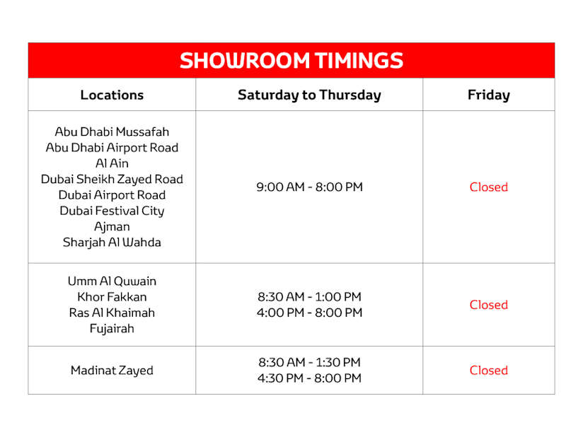 Toyota dubai showroom timings. Abu Dhabi - Mussafah - The Wave. Click to learn more. Buy new and used Toyota cars with Al-Futtaim Motors the exclusive distributor in the UAE and get the best offers.